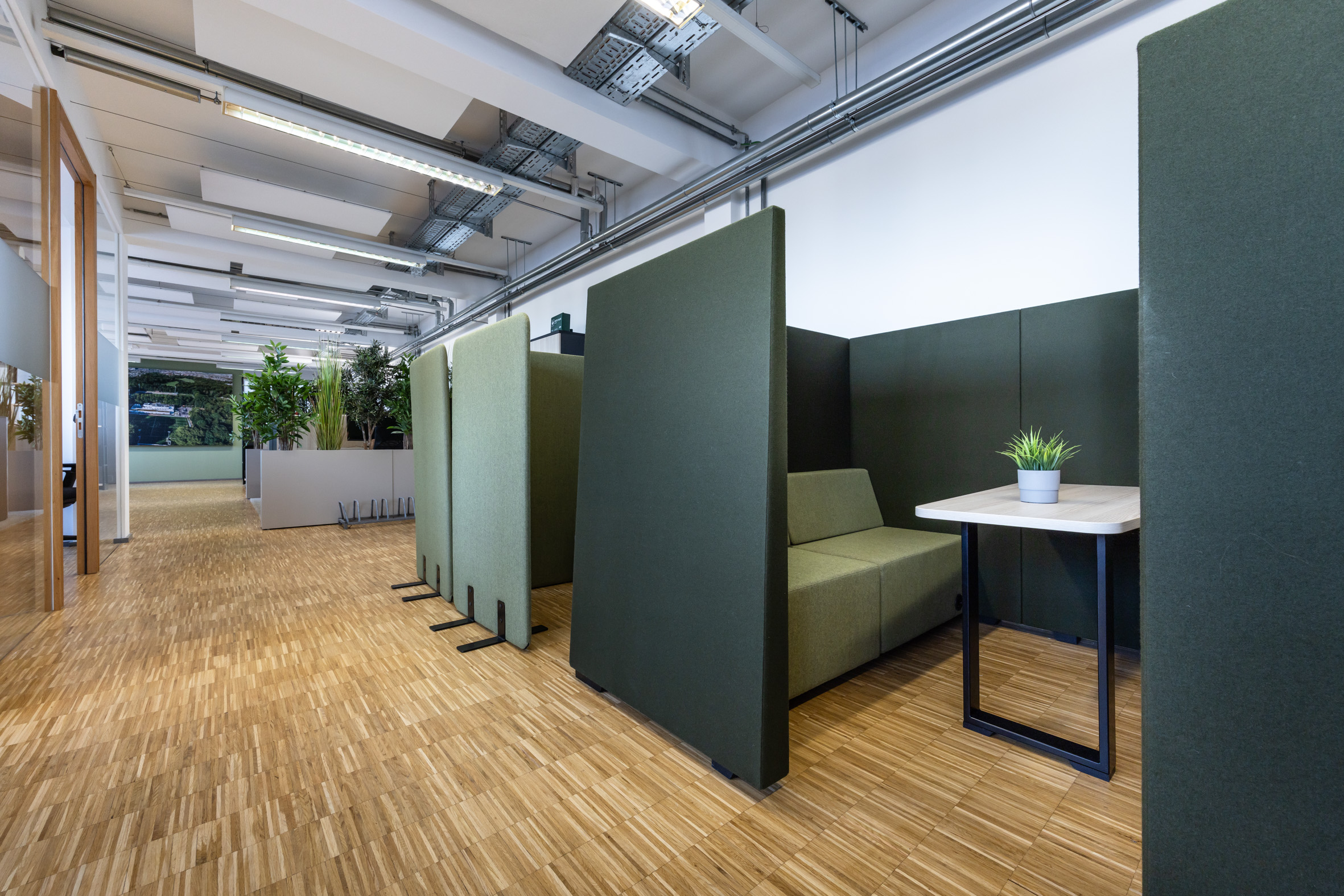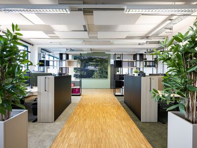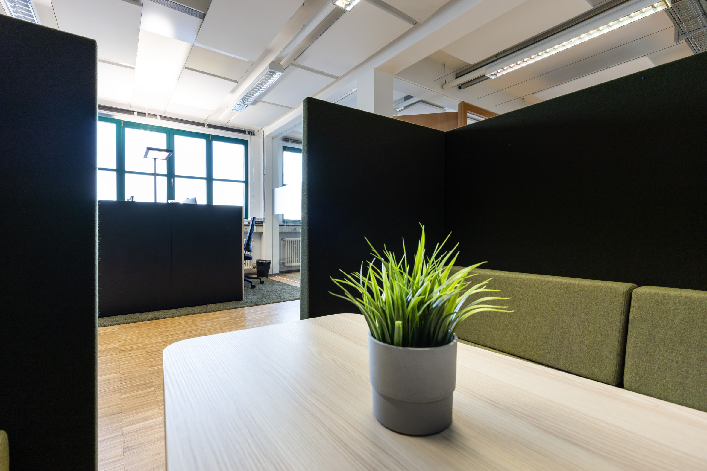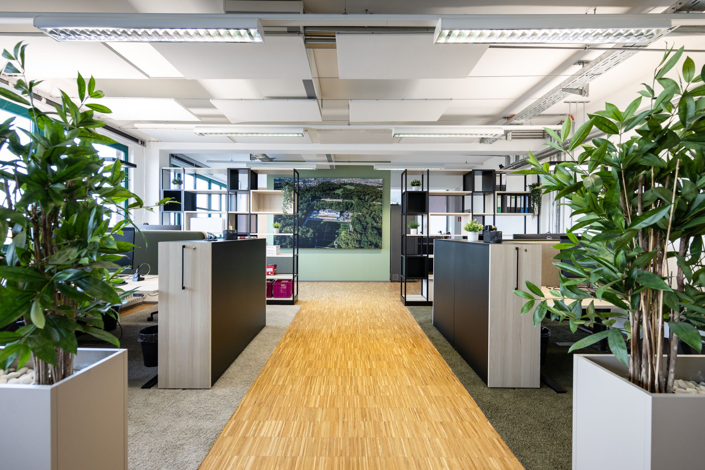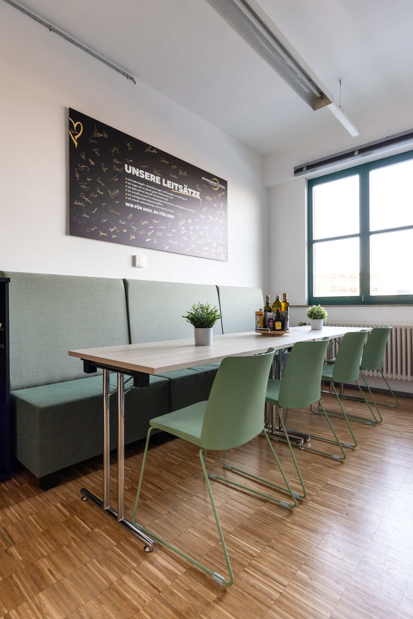 Für das Kölner Unternehmen Physiosport entwickelten wir die neue Verwaltungszentrale – gestartet mit einem Mitarbeiterworkshop, der den Veränderungsprozess aktiv begleitete und Wünsche wie Bedürfnisse sichtbar machte. Diese Impulse flossen direkt in Konzept, Planung und Einrichtung ein. Auf rund 400 m² entstanden moderne Arbeits- und Meetingflächen für 14 Arbeitsplätze. Als gestalterisches Leitmotiv wählten wir den Kölner Grüngürtel und übersetzten ihn in natürliche Elemente, die Identität stiften und eine besondere Atmosphäre schaffen.
