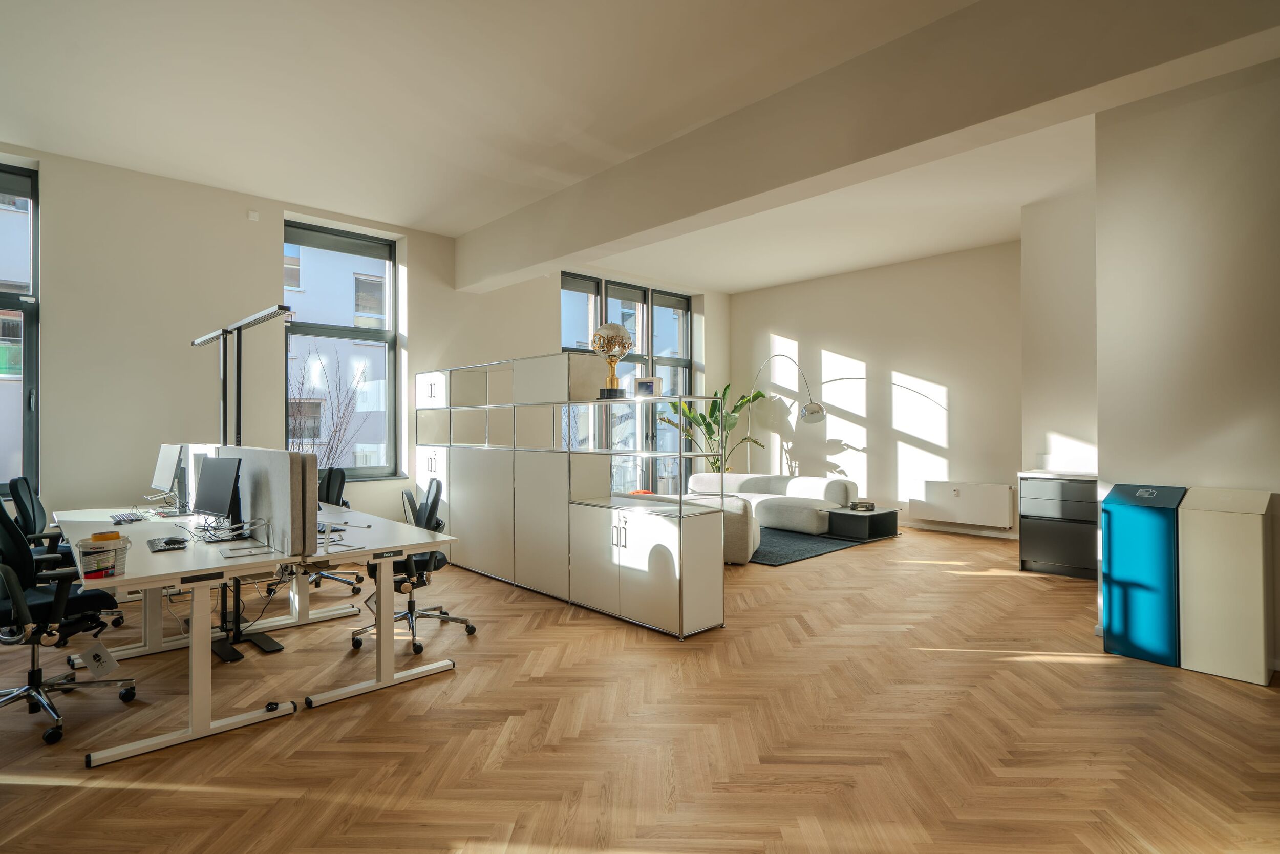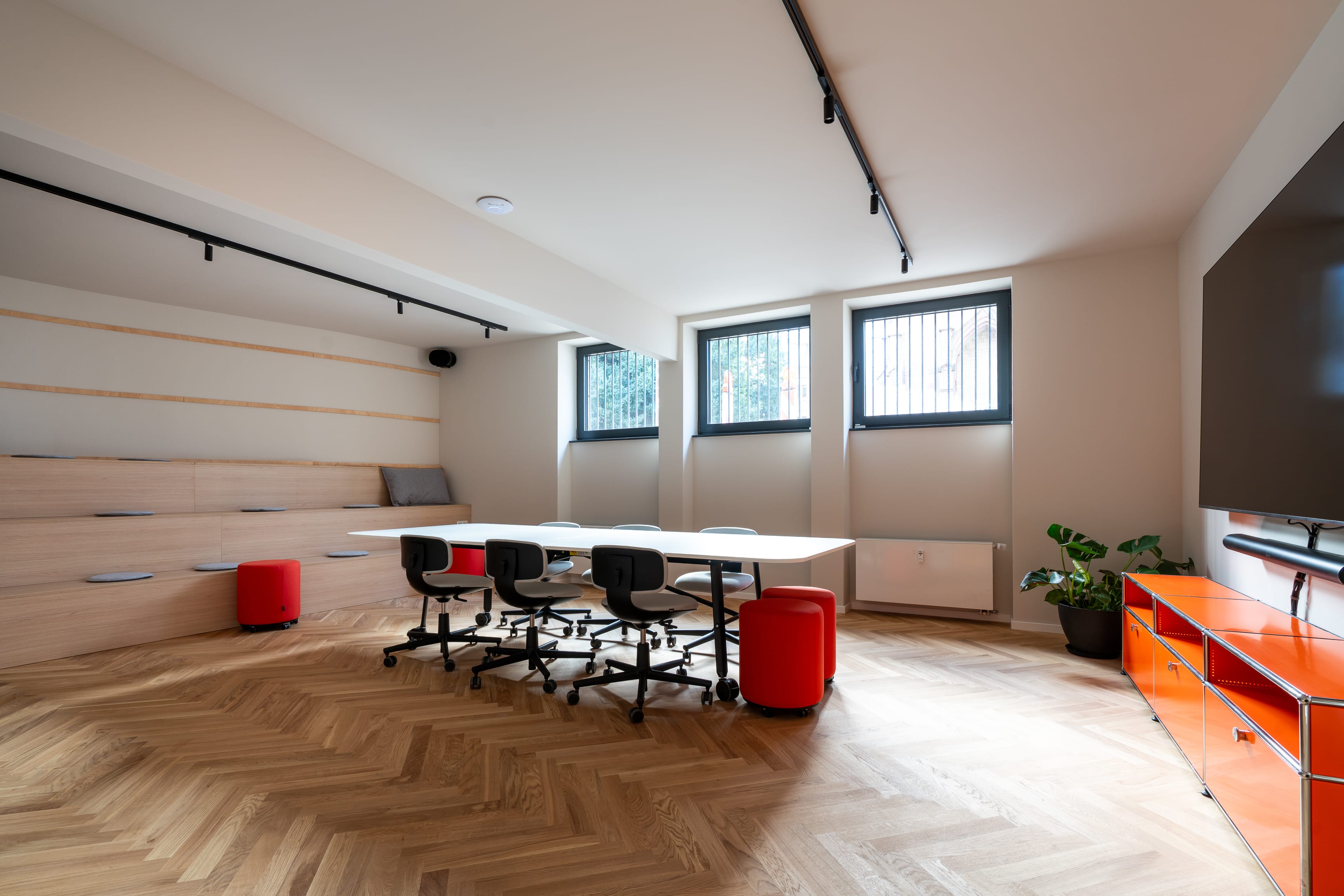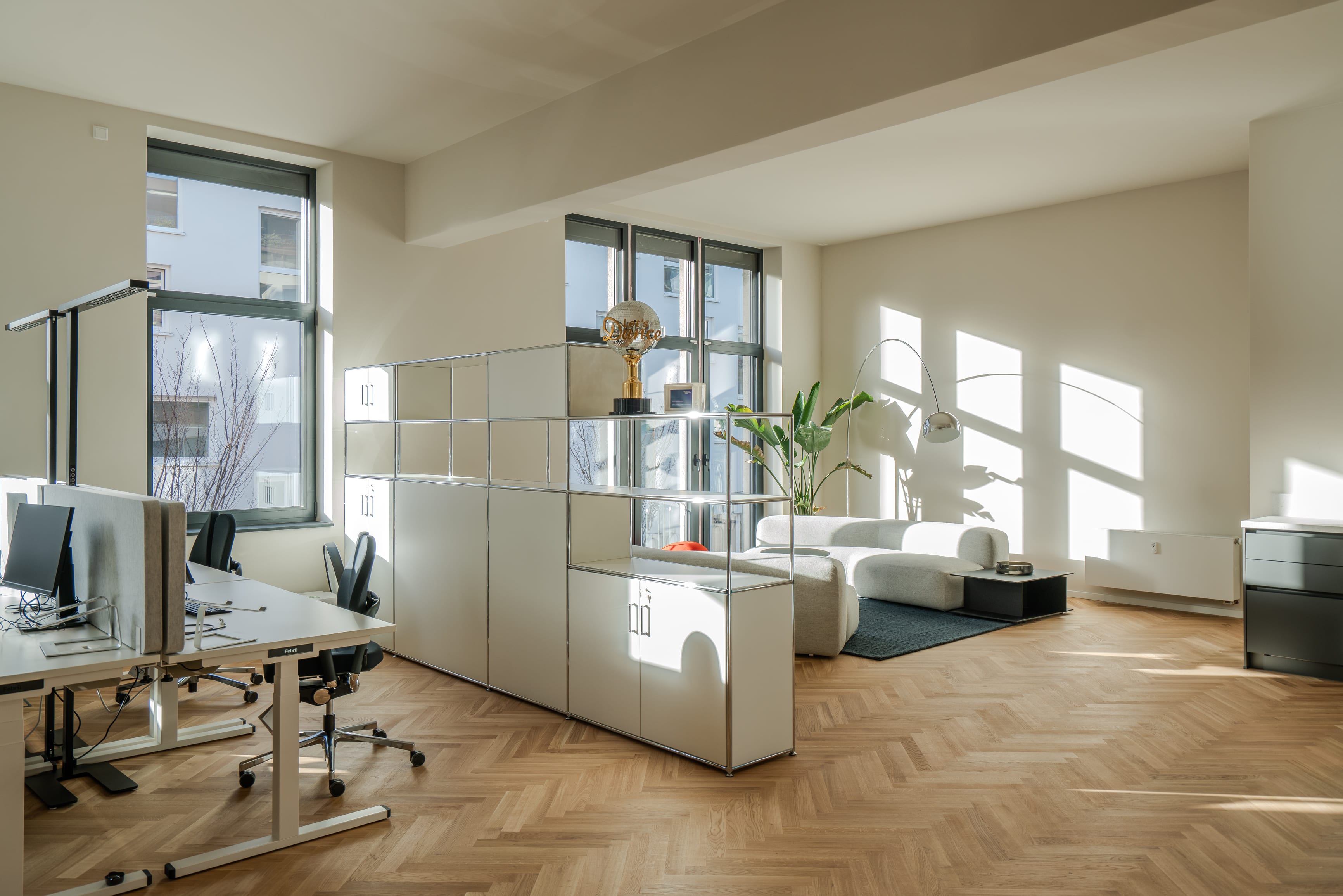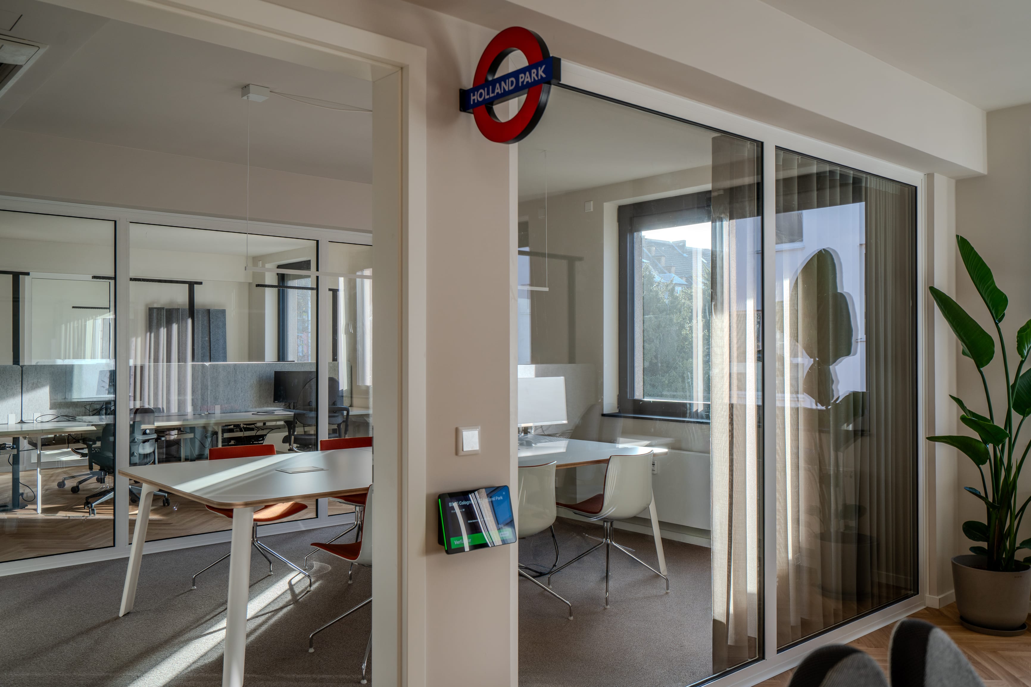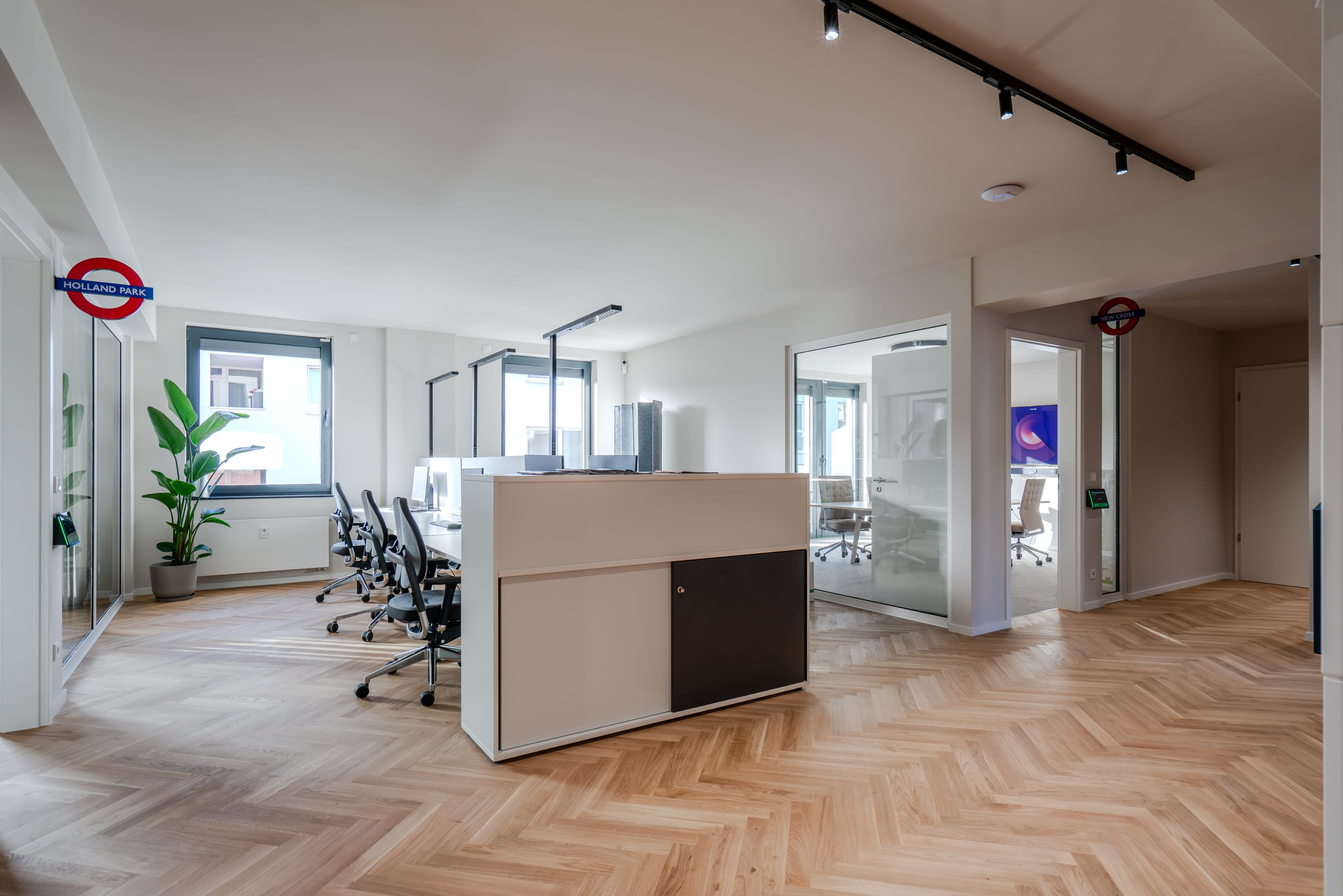 Aus diesen Erkenntnissen entwickelten wir ein ganzheitliches Raumkonzept für vier Etagen. Entstanden ist eine elegante, hochwertige Arbeitswelt mit klarer Struktur, durchdachter Zonierung und modernen Arbeits- sowie Meetingbereichen. Rückzugsorte für konzentriertes Arbeiten stehen ebenso im Fokus wie kommunikative Flächen für Austausch und Redaktion. Gestalterisch verbindet das Konzept zeitlose Materialien mit gezielt gesetzten Highlights, die auf die Markenidentität einzahlen – mit punktuell charmantem Augenzwinkern in Richtung der britischen Wurzeln. Das Ergebnis ist eine stimmige, repräsentative und zugleich lebendige Arbeitsumgebung, die die Unternehmenskultur von BBC Germany sichtbar macht und Raum für zukünftige Entwicklungen bietet.
