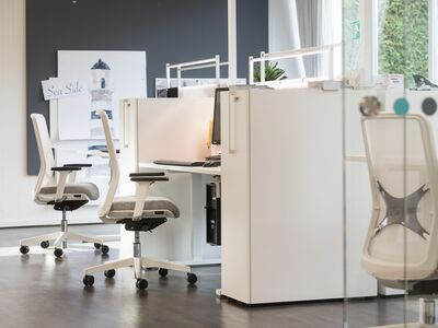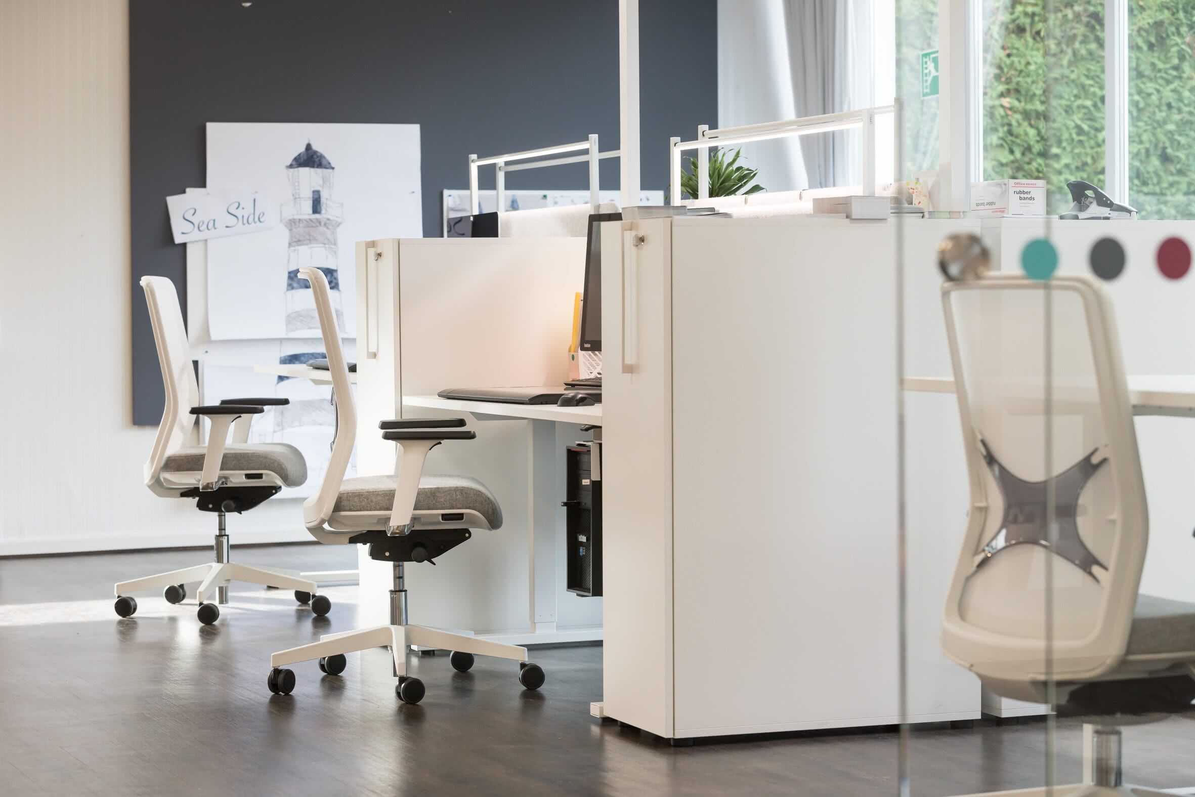 The Seaside of Workspace: Die neuen Büros wurden 2019 komplett von uns konzipiert und realisiert. Die ergonomischen Sitz-Steh-Arbeitsplätze sind auf verschiedene Open Space Zonen aufgeteilt. Seitliche Hochcontainer verschaffen zusätzlichen Stauraum und bieten Sichtschutz. Leichte, freundliche Farben und akustisch wirksame Elemente, kombiniert mit raffinierten Farbakzenten runden das Bürokonzept optimal ab.