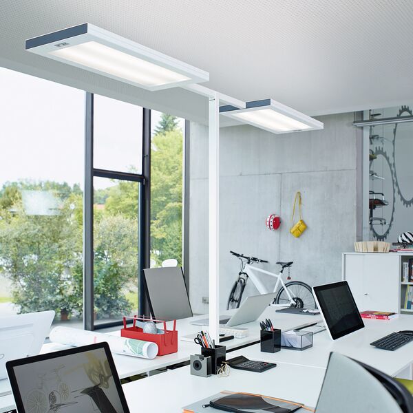 Eine umfassende Raumbeleuchtung lässt sich über Deckenleuchten am einfachsten realisieren. Dabei machen flächige Lichtpaneele einen besseren Job als einzelne Hängelampen, da sie einen wesentlich größeren Bereich abdecken und sich zudem nicht in Monitoren spiegeln.